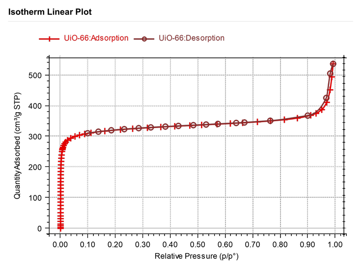 SiCOPE 40微孔分析仪采用的He-Free自动后标定技术,摒弃了先通氦气标定再测试的传统流程,而是先进行氮气吸附实验,在获得完整的吸附-脱附等温线后,再自动进行后标定测试,从根本上消除了因氦气滞留微孔所导致的测量误差。以下是采用国仪量子SiCOPE 40微孔分析仪对UiO-66材料的表征案例。如图1所示,该UiO-66的比表面积为1259.44 m2/g,高比表面积可以提供更多的活性点位,有利于提高其吸附性能。从N2-吸脱附等温线(图2)可知,在低分压区(P/P0<0.1)吸附量存在急剧上升的趋势,表明材料具有丰富的微孔结构。基于无氦气干扰的吸附数据,通过NLDFT(非定域密度函数理论)孔径分布图可进一步分析样品的孔径分布,支持自动生成 “微孔-介孔-大孔”的孔容占比分析,无需手动计算,提升数据分析效率。SiCOPE 40微孔分析仪的He-Free自动后标定技术在此类MOFs材料分析中展现出明显优势,消除了传统测试因氦气残留导致的计算偏差,确保了比表面积和孔径表征数据的准确性。