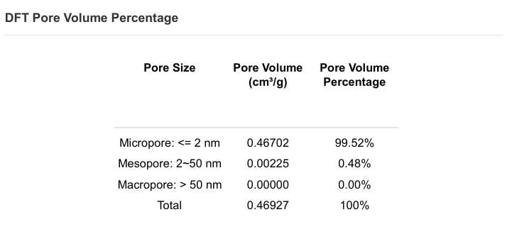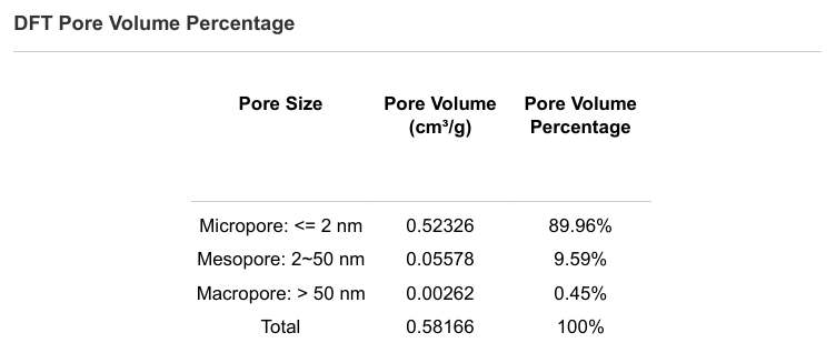 以下是采用国仪量子SiCOPE 40微孔分析仪对椰壳活性炭材料的表征案例 。测试过程中使用空气隔离塞/真空隔离塞,将样品在回填保护气/真空状态下从脱气站转移至分析口,从脱气、转移到测试全程阻断外部干扰,解决了传统设备因空气污染导致的测试偏差问题,为超微孔材料的精准表征提供了关键保障。图4为椰壳活性炭的比表面积测试结果1377.10 m2/g。通过分析等温线(图5)可知,椰壳活性炭主要属于Ⅰ类等温线。进一步采用NLDFT全孔径分析(图6),椰壳活性炭的总孔体积为0.58 ml/g,微孔体积占比89.96%。此外,在报告处理环节,SiCOPE 40 微孔分析仪同样展现优势,交互式数据分析界面支持拖拽数据拟合计算,可实时呈现比表面积、孔径分布曲线等关键参数,同时兼具“BET 一键智能选点”功能可自动识别微孔材料的BET线性区间,解决了传统设备中微孔材料BET段前移的选点难题,无需人工干预即可自动选取合适的BET选点范围,避免人工选点偏差。