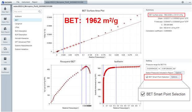 仪器防线:软件支持 BET 一键智能选点。这一功能彻底解决了微孔材料 BET段前移的选点问题,直接消除不同人员处理数据的偏差,让结果客观且高度可重复。同时内置不少于 40 种的 NLDFT 孔径高级模型,让复杂数据的解析变得轻松且标准化。