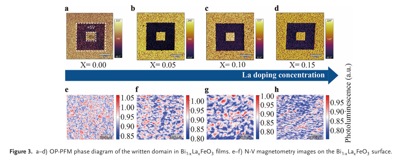 近日,北京航空航天大学研究团队在《Advanced Physics Research》发表成果:通过磁控溅射技术优化镧掺杂铋铁氧体(Bi₁₋ₓLaₓFeO₃,BLFO)薄膜的制备工艺,并借助国仪量子扫描NV探针显微镜(SNVM) 精准解析微观磁畴结构,成功突破多铁性材料在低温规模化制备与自旋电子器件无场切换中的核心瓶颈,为下一代超低功耗存储器件发展提供关键技术支撑。