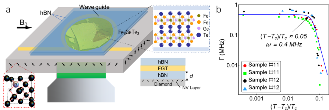 近日,中国科学技术大学石发展教授、合肥微尺度物质科学国家研究中心曾华凌教授和物理学院龚明教授团队合作,利用金刚石氮-空位(NV)色心量子传感技术,首次在实验上揭示了二维铁磁材料Fe₃GeTe₂在相变临界点的磁噪声谱演化规律,并成功建立了临界涨落与标度理论的直接关联。相关研究成果于9月29日以“Critical fluctuations and noise spectra in two-dimensional Fe₃GeTe₂ magnets”为题于发表于《自然·通讯》[Nature Communications 16, 8585 (2025)]。