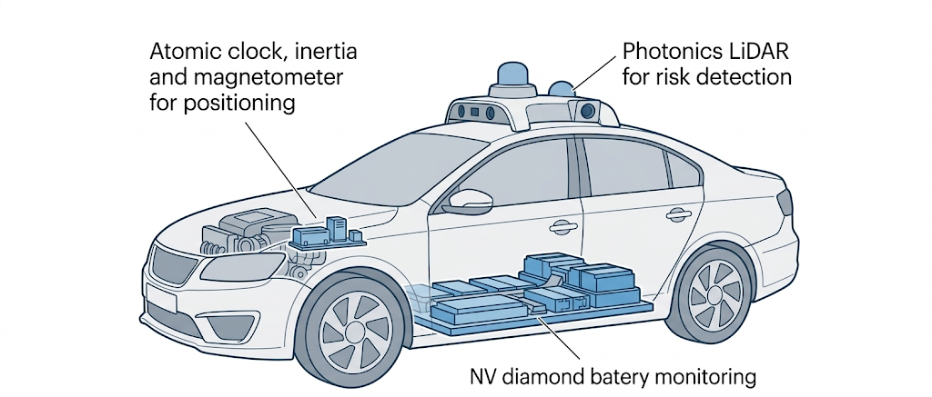 电动汽车的发展不仅是交通工具的革新,更是助力国家双碳战略落实的关键。量子磁测量技术能够实现电池全生命周期状态(SOC/SOH)高精度监测:目前电池管理系统(BMS) 估算依赖传统传感器,其零点漂移会随着时间不断累积,最终导致仪表盘电量“虚标”或断崖式掉电。量子测量具有物理学上的绝对稳定性和极低的零漂,能够为 SOC 算法提供长期免校准的高准确数据,极大提升续航里程预测的真实性。此外,量子测量技术在自动驾驶的量子增强视觉与定位导航等方面亦有应用前景。
