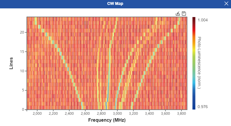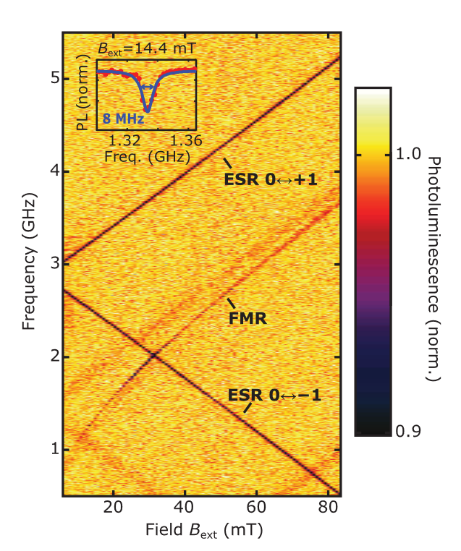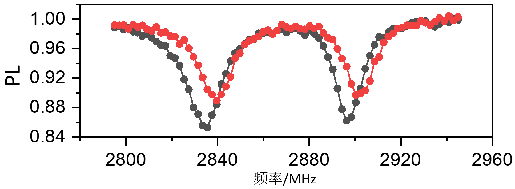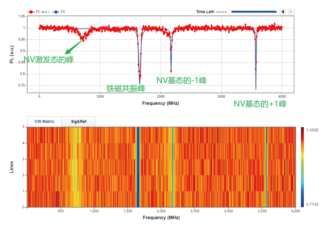 利用NV测样品铁磁共振谱时,需要注意区分NV激发态峰与微波功率放大器倍频效应引起的额外的峰。如图所示,峰分为是NV激发态的峰、样品铁磁共振引起的峰、基态ms=0到ms=-1的跃迁峰、基态ms=0到ms=+1的跃迁峰。