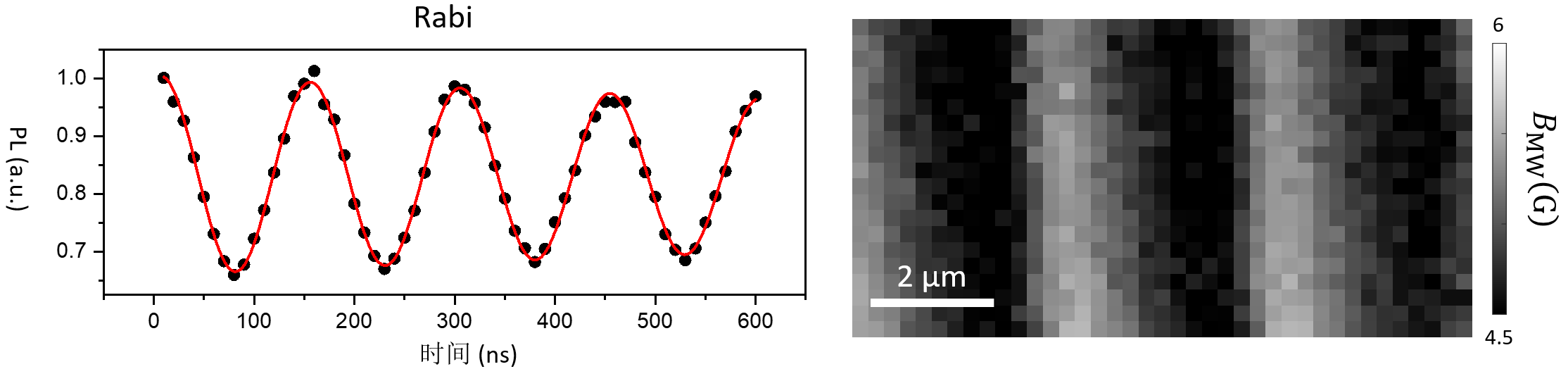 左图:金刚石NV探针的Rabi信号。右图:利用Rabi对芯片表面微波场分布进行成像。(测试仪器:国仪量子SNVM)
