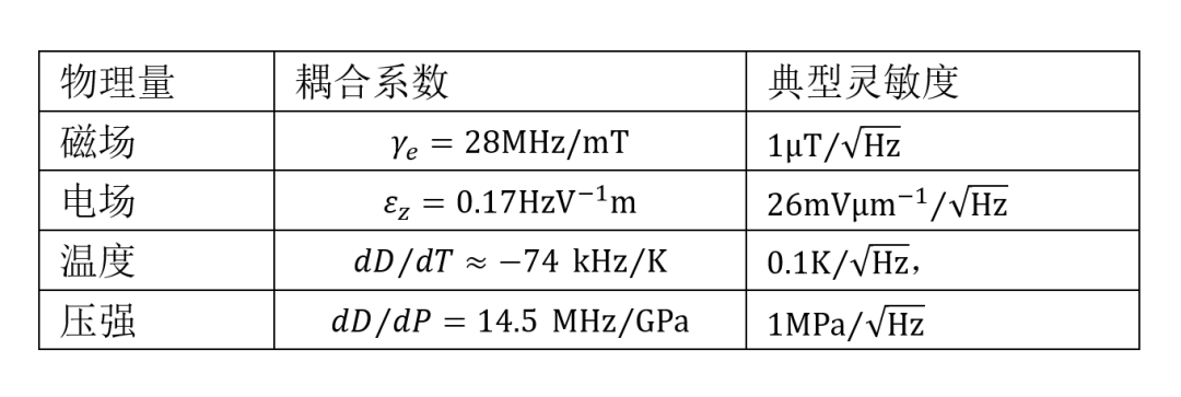 第一项零场分裂参数D与温度和压强有关,第二项E与电场、应力有关,第三项中的B是磁场。这一物理特性使NV色心成为天然的多物理量量子传感器,可实现电场、温度与压强的高灵敏度探测。下表是各物理量的耦合系数与典型灵敏度。