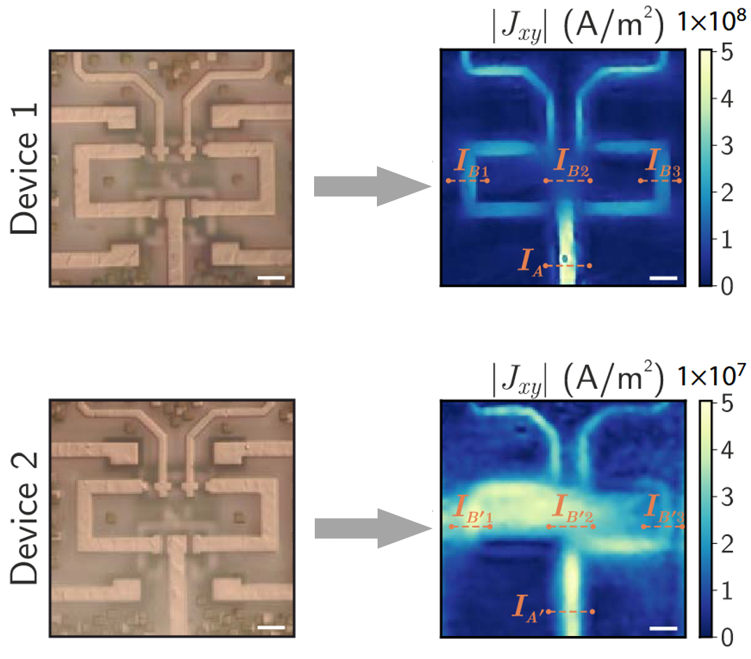 左图:光学显微镜下器件。右图:利用量子钻石显微镜对电流密度成像[2]。