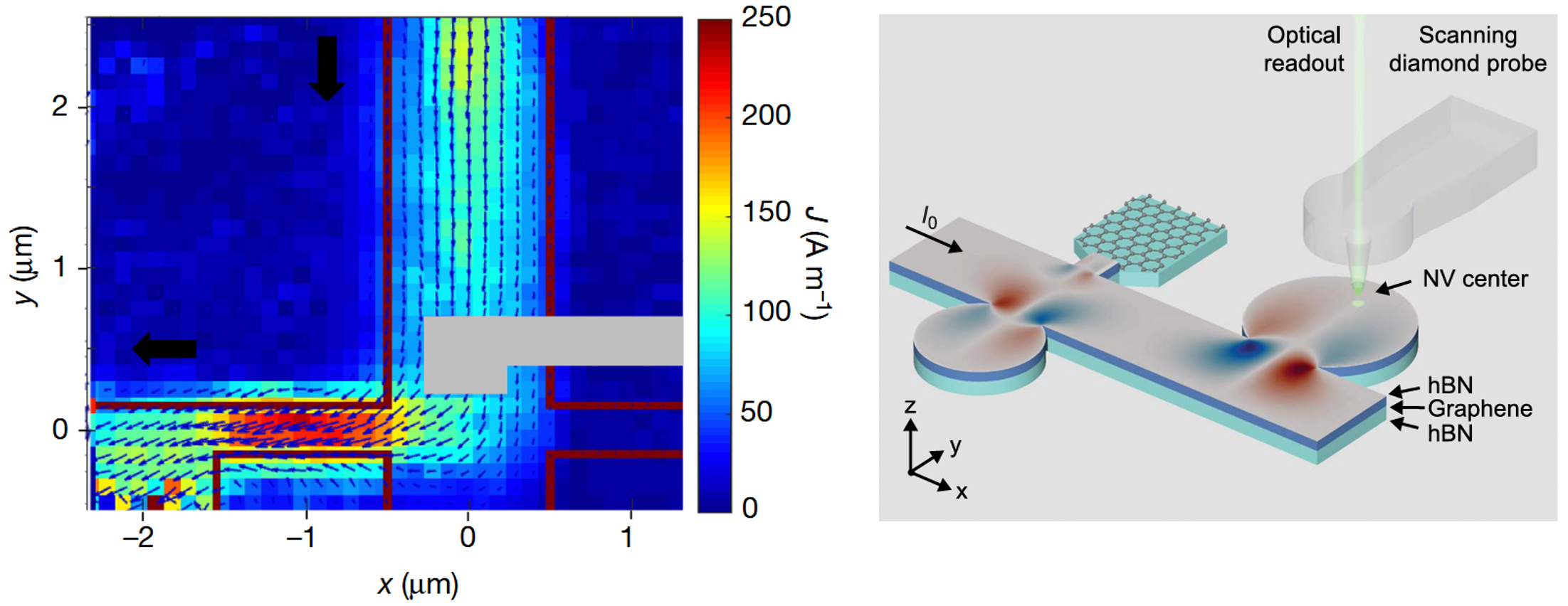 左图:石墨烯中电流密度分布,通过定量分析,发现电流有“粘性”。右图:封装式单层石墨烯(hBN-MLG-hBN)器件与稳态电流涡旋[4]。