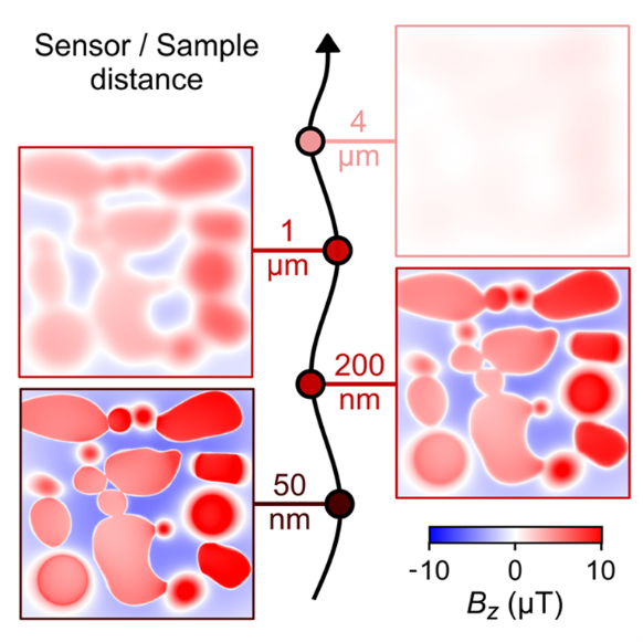 NV与正极表面处于不同距离时,来自LixCoO2颗粒的磁杂散场(模拟数据)[1] 。