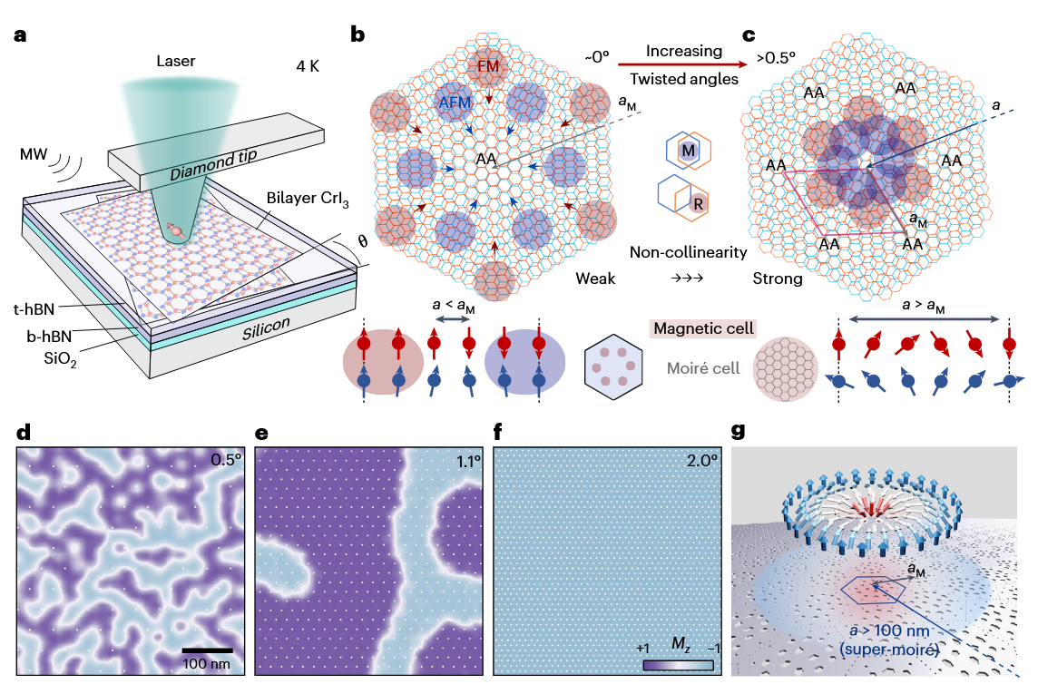 tDB CrI3中竞争性磁序的演变。a,SNVM技术示意图。b,近零扭曲角下莫尔调制磁相互作用的示意图。c,较大扭曲角下竞争性磁序的示意图。d-f,扭曲角分别为0.5°(d)、1.1°(e)和2°(f)时,450 nm区域的原子模拟归一化磁化强度图。g,与莫尔堆叠相关的拓扑磁织构示意图。