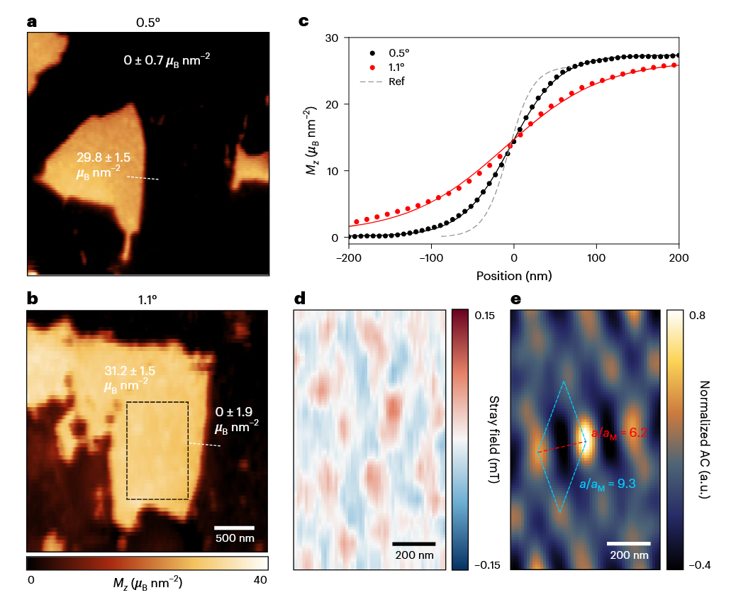 NV色心通过探测局域杂散场的引起的塞曼分裂,结合反演算法,直接重构出面外磁化强度的纳米级分布图。在1.1°的扭转角度下,团队清晰分辨出: