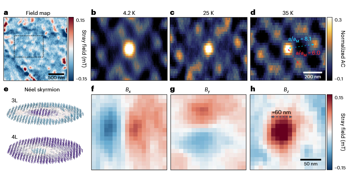 tDB CrI3中AFM Néel型斯格明子的出现。a,1.1° tDB CrI3样品在500 mT磁场冷却后于4 K下拍摄的代表性杂散场图。 b-d,a中所选区域在4 K(b)、25 K(c)和35 K(d)时的二维自相关图,表明磁性纹理在高温下的稳定性。e,tDB CrI3的原子模拟,包含了hBN/CrI3界面的界面DMI。Néel型斯格明子出现在第3层和第4层。f-h, Bx(f)、By(g)和Bz(h)场。场分布与e中所示的模拟Néel型斯格明子相似,根据Bz分布,特征尺寸约为60 nm。