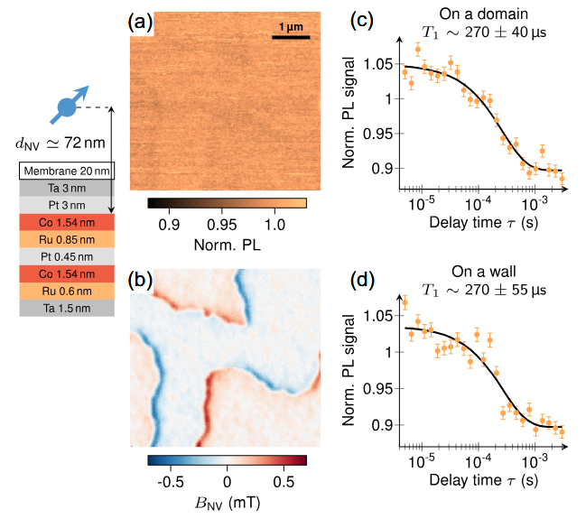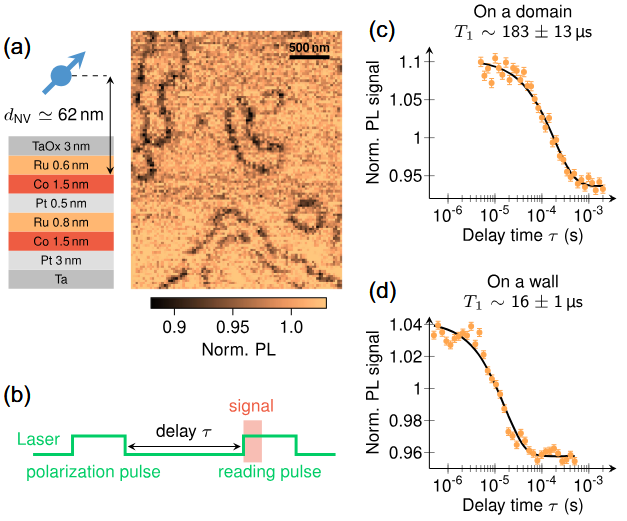 合成具有左手性Néel畴壁的合成反铁磁样品。(a)SNVM扫描得到噪声谱图揭示了畴壁的存在。(b)获取弛豫时间曲线的测量序列示意图。(c)、(d)在畴(c)上方或壁(d)上方测量的弛豫时间曲线,显示壁上方的T1显著降低。