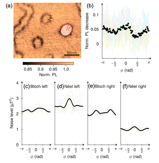 如果说第一篇工作是给磁性结构"拍高清照片",那么这项工作则是"聆听磁性的心跳"。法国研究团队开发了基于NV色心纵向弛豫时间(T1)的扫描噪声谱学方法,利用局域热自旋波噪声,可定性判断 DMI 的符号,并对其强弱及磁结构的 Néel/Bloch 性质提供线索。