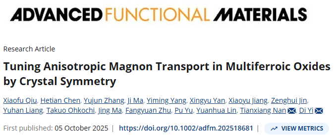 近期,《Advanced Functional Materials》刊登了清华大学新型陶瓷材料全国重点实验室易迪老师课题组与集成电路学院南天翔老师课题组关于多铁性氧化物BiFeO₃(BFO)体系磁振子输运的重要研究。该研究题为“Tuning Anisotropic Magnon Transport in Multiferroic Oxides by Crystal Symmetry”。这项研究揭示了晶体对称性对磁振子输运各向异性的关键调控作用。