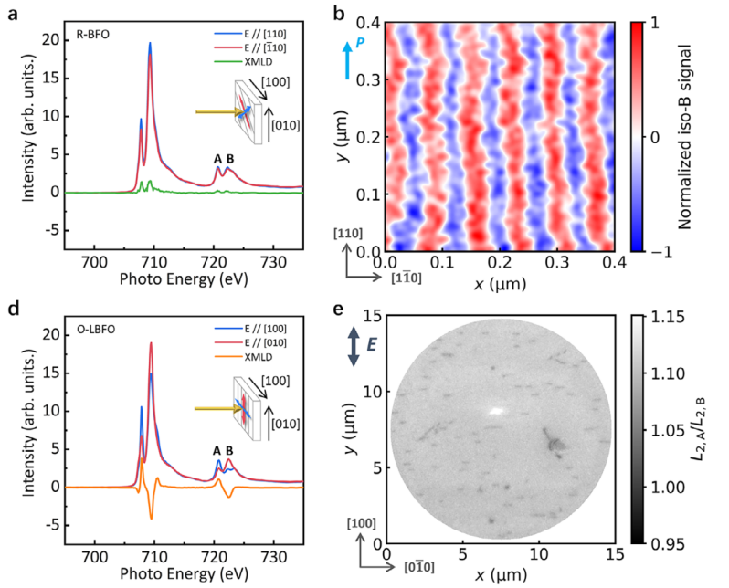 单畴 R-BFO 与 O-LBFO 的磁结构 。a) LSMO(22 nm)/R-BFO(10 nm)样品的 X 射线磁线性二色性(XMLD)光谱 b) LSMO(2 nm)/R-BFO(10 nm)样品的氮空位(NV)成像图。实验中选用厚度仅为2 nm LSMO 层,以避免其杂散磁场对测量产生干扰 d) LSMO(22 nm)/O-LBFO(10 nm)样品的 XMLD 光谱 e) LSMO(22 nm)/O-BFO(10 nm)样的 X 射线磁线性二色性-光电子发射显微镜(XMLD-PEEM)成像图。